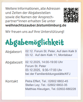 Verschiedene Einrichtungen des Bistums Limburg haben sich deshalb in diesem Jahr erneut zur Aktion Weihnachtszauber zusammengetan. Wie bereits in den letzten Jahren kooperieren die Katholische Fachstelle für Jugendarbeit Westerwald/Rhein-Lahn (KFJ) mit der Katholischen Familienbildungsstätte Westerwald/Rhein-Lahn in Montabaur.